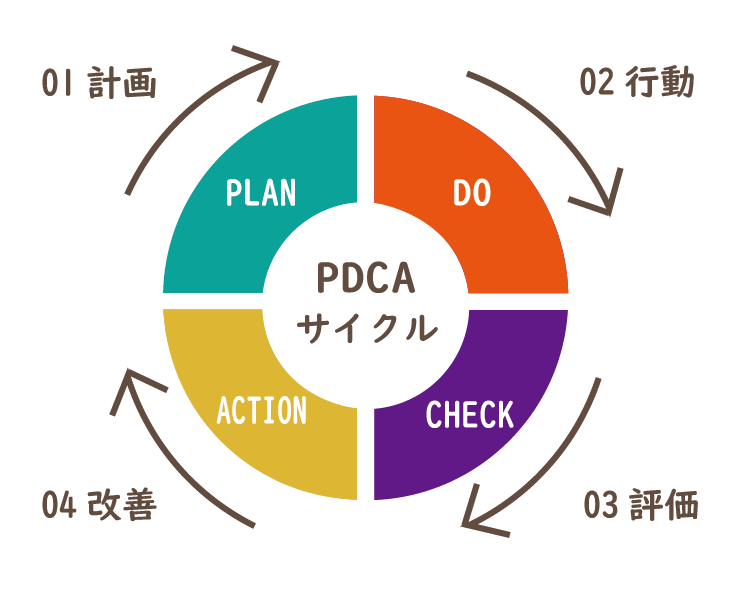 そのため、計画の策定から実行、評価、改善までを一つの流れとし、PDCAサイクル(Plan=計画、Do=実行、Check=評価、Action=改善)を継続的に行いながら、最適な支援の提供を目指します。